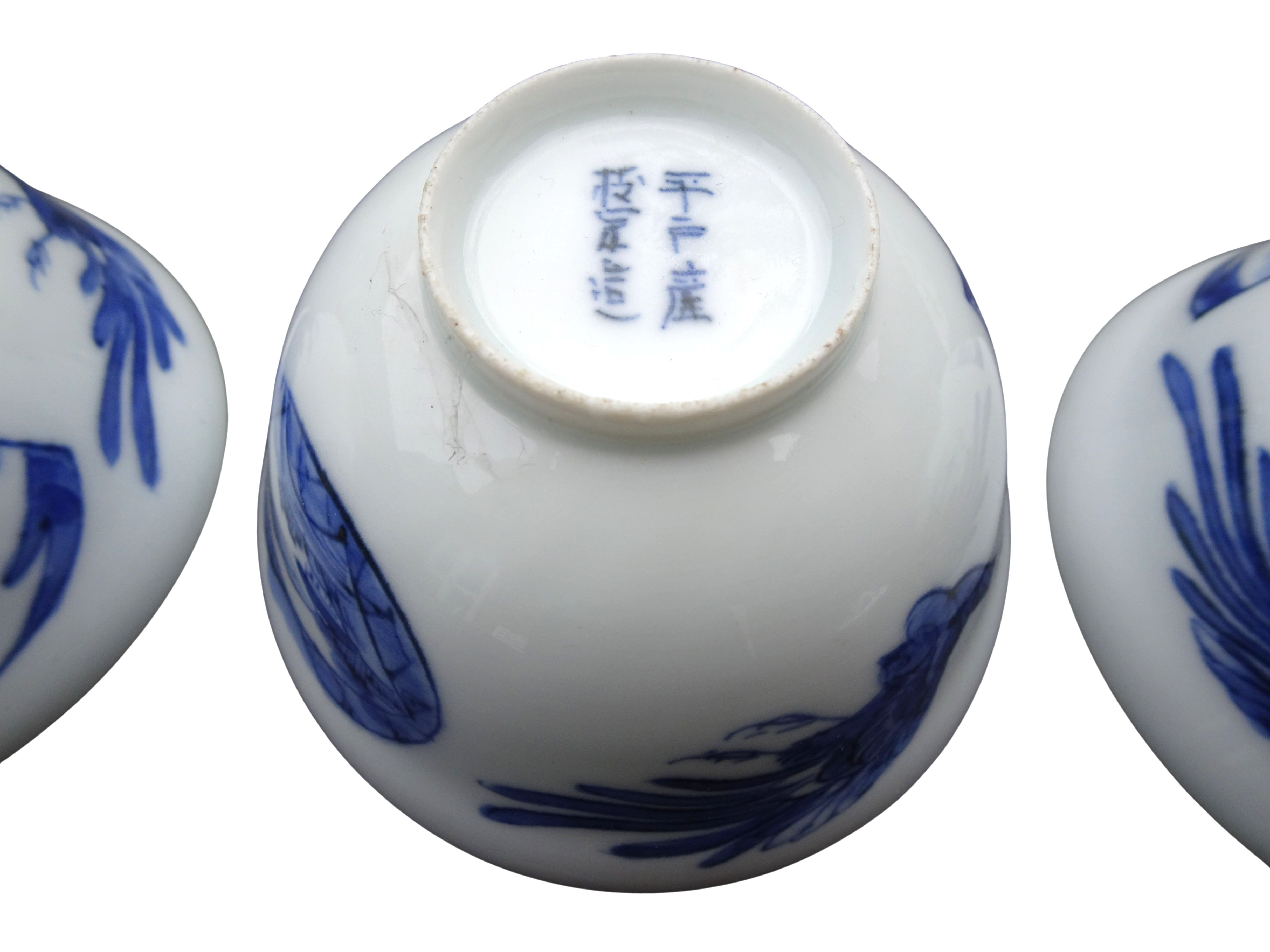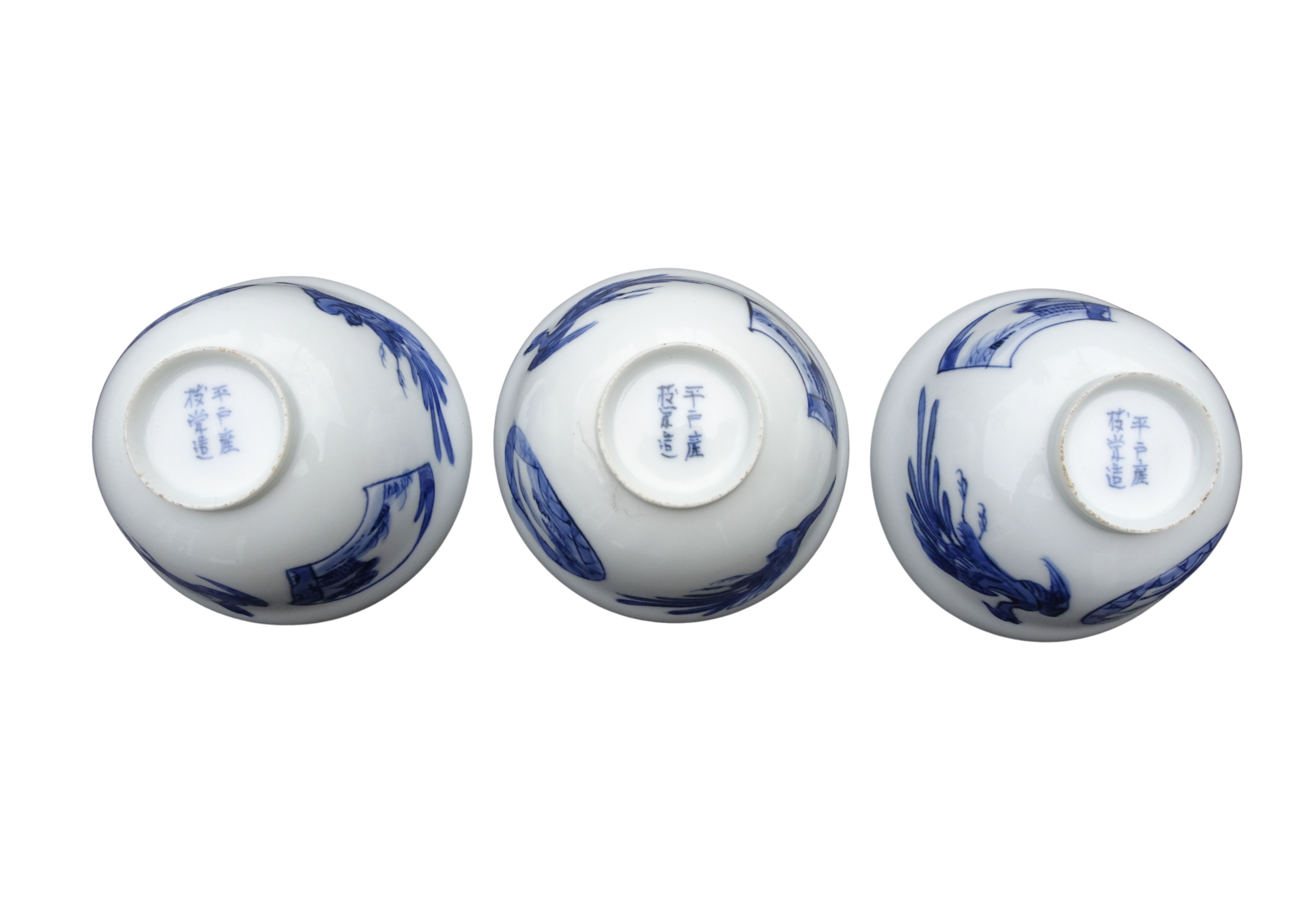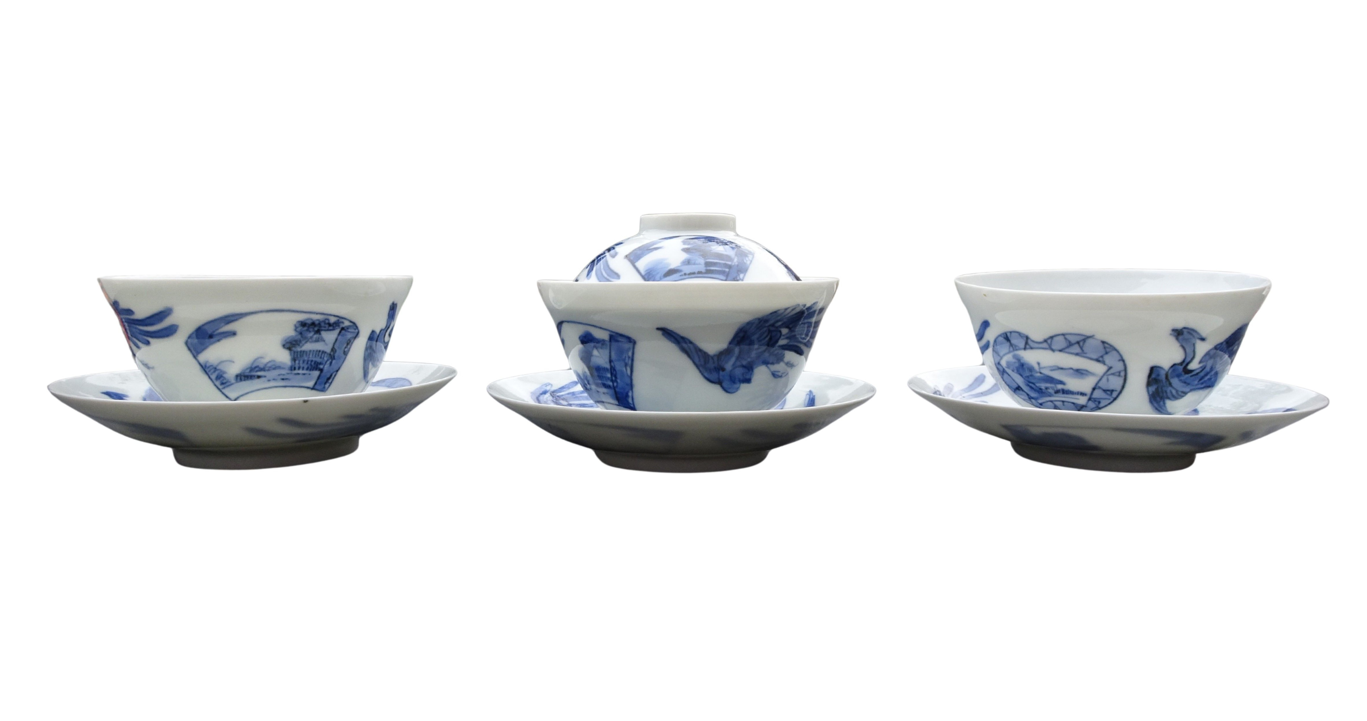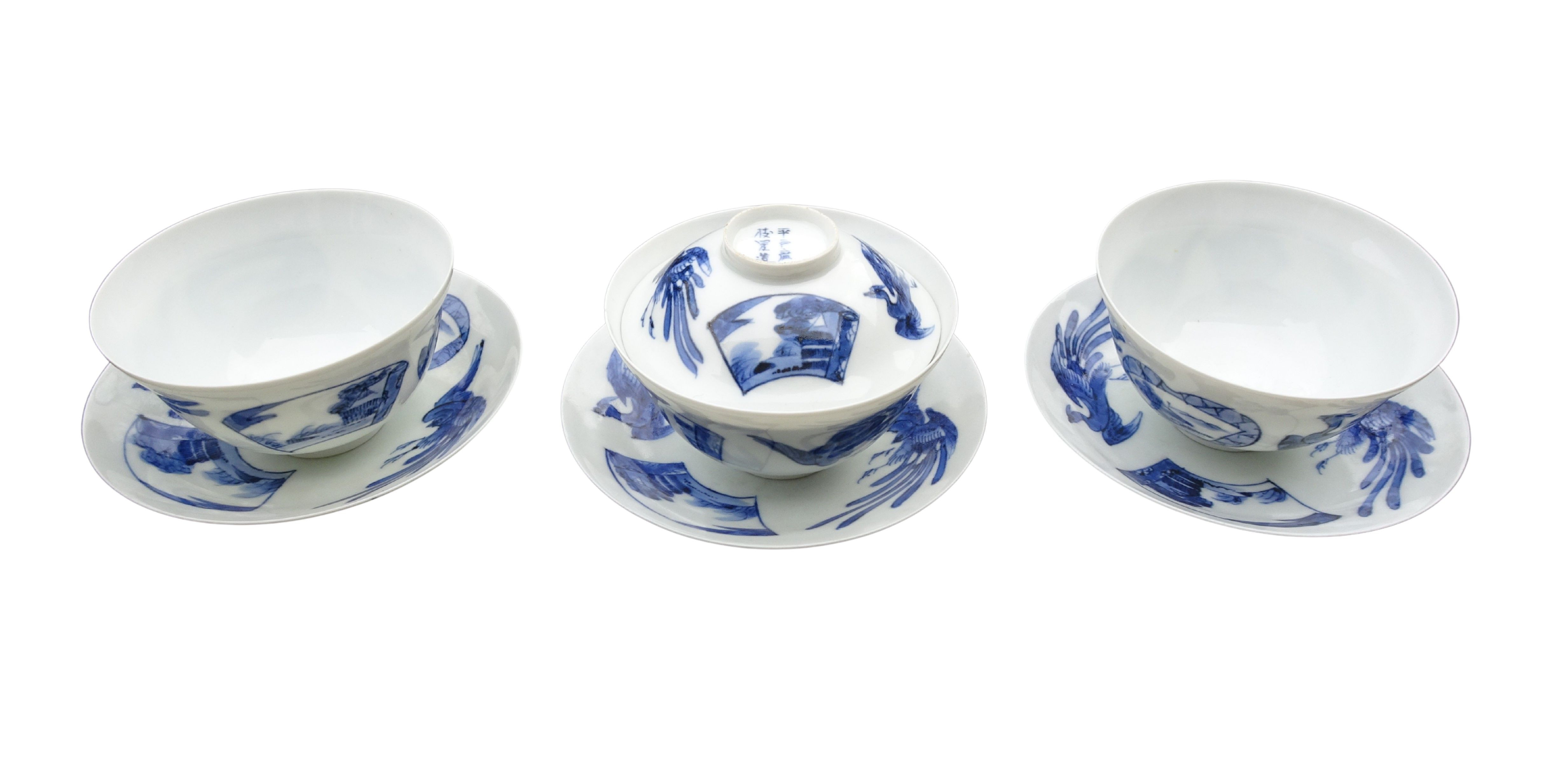 Antieke Japans Hirado Makavachi eierschaal porseleinen blauw wit, 3 theekommen met schotels en 1 deksel.