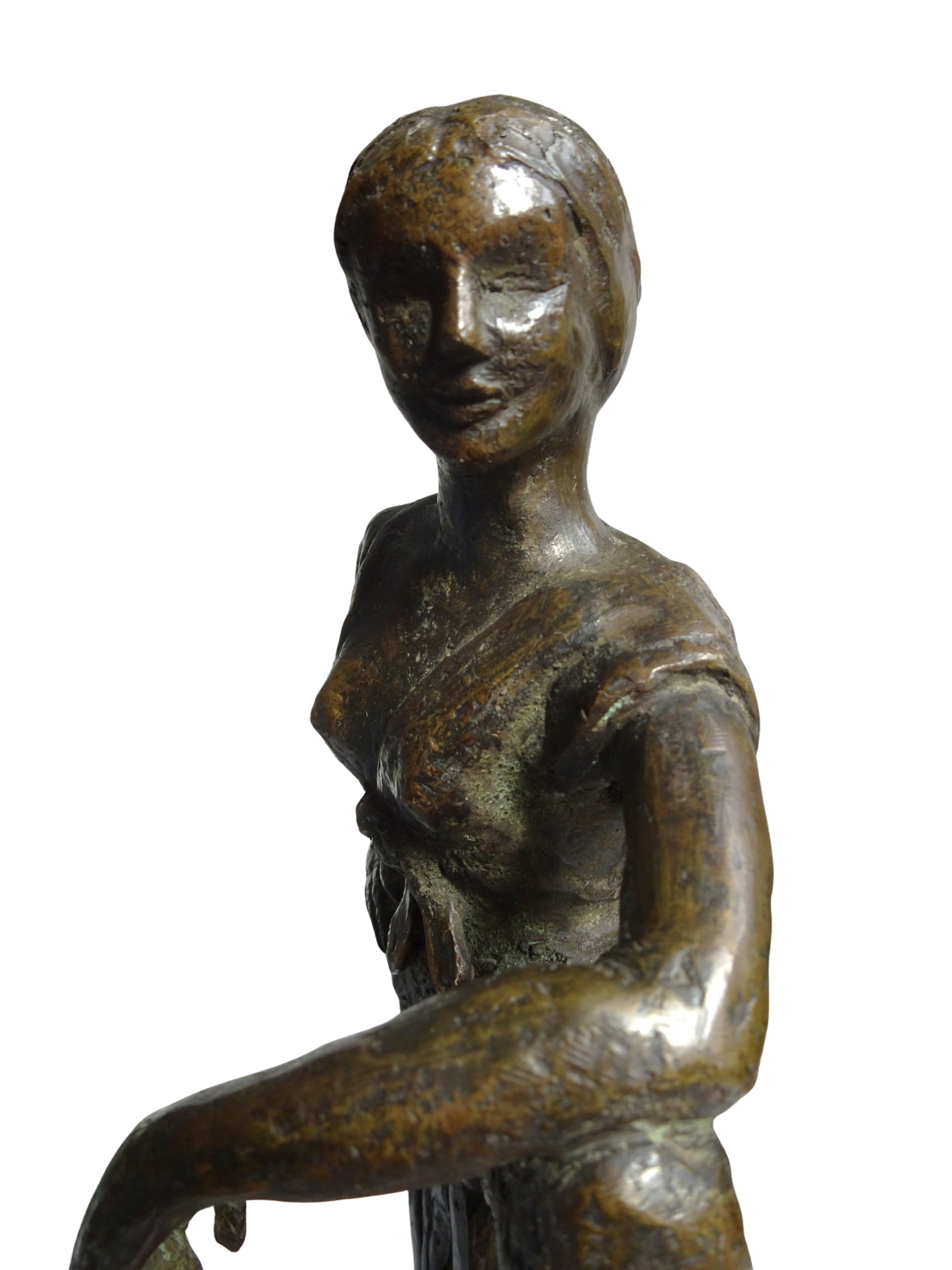 Bronzen beeldje van jonge vrouw op houten voetstuk.
