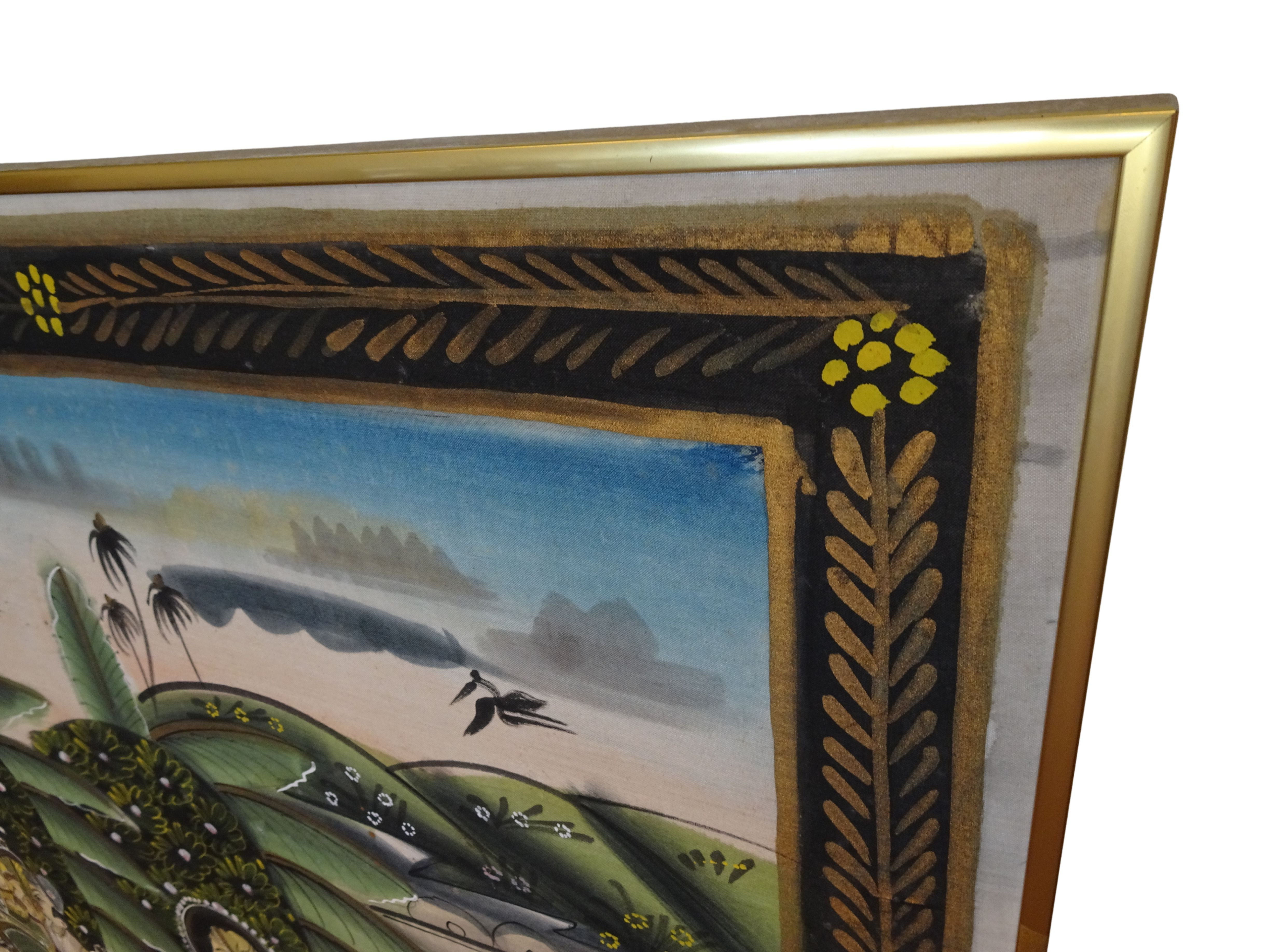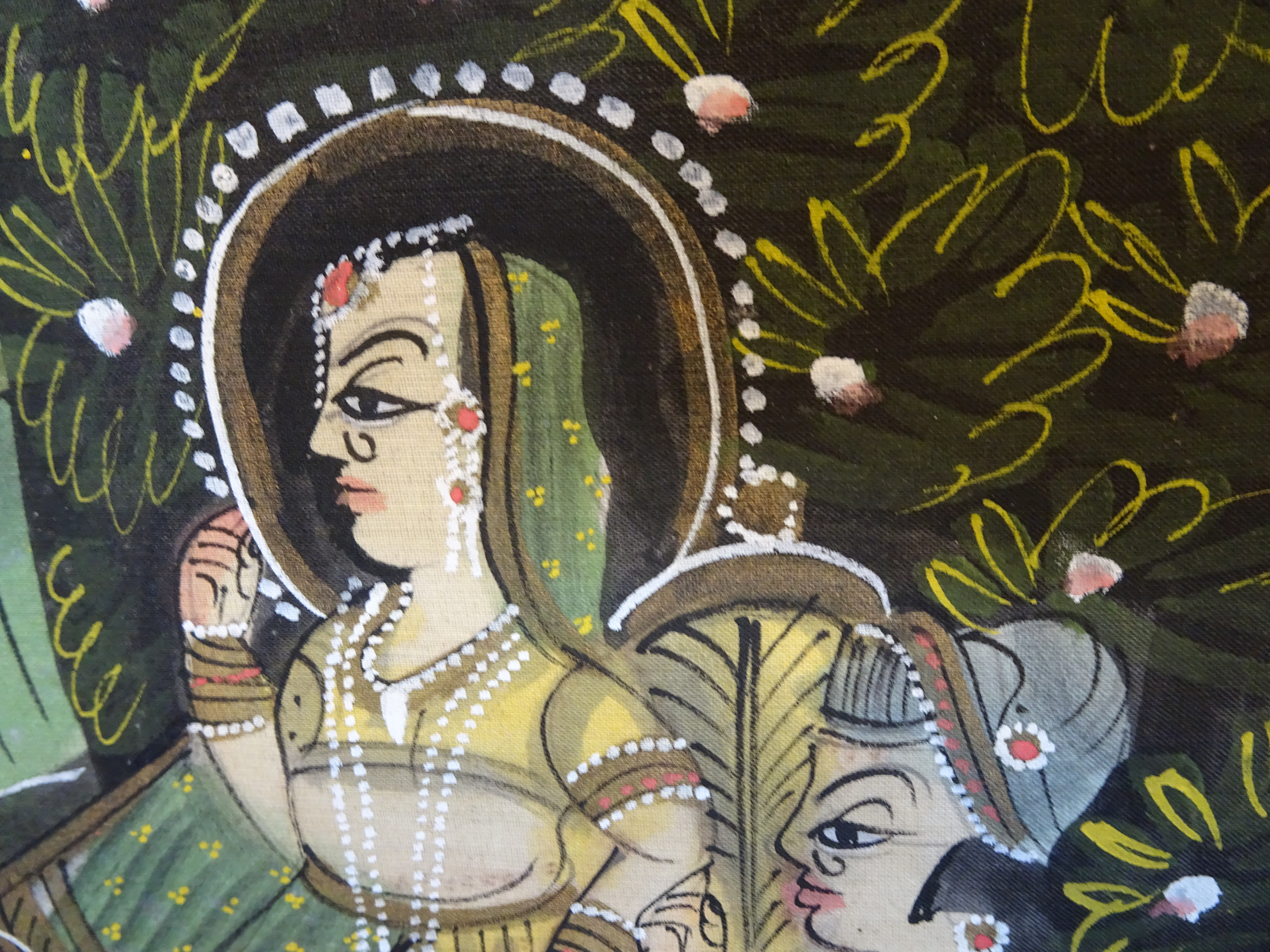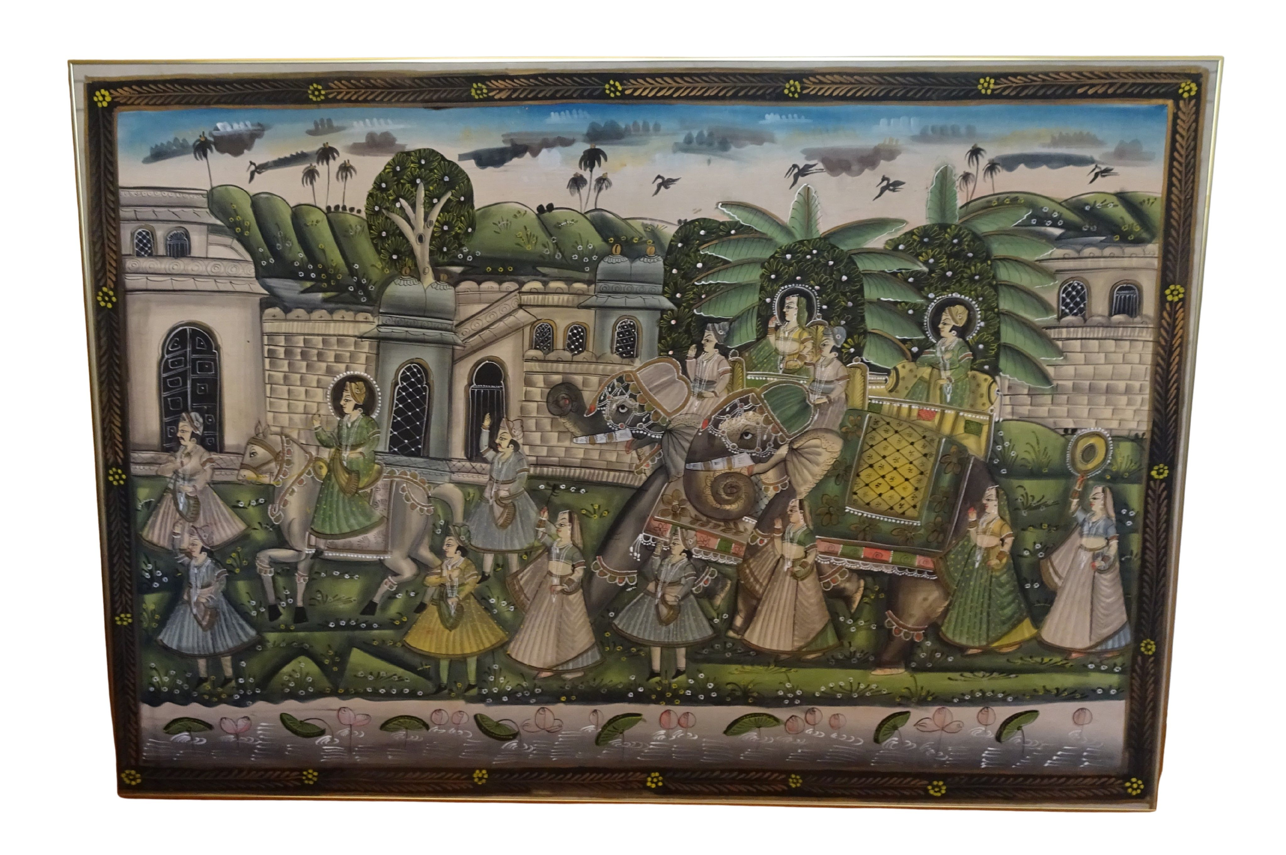 Groot Indiaans schilderij op stof, 20 eeuw, ingelijst in gouden lijst