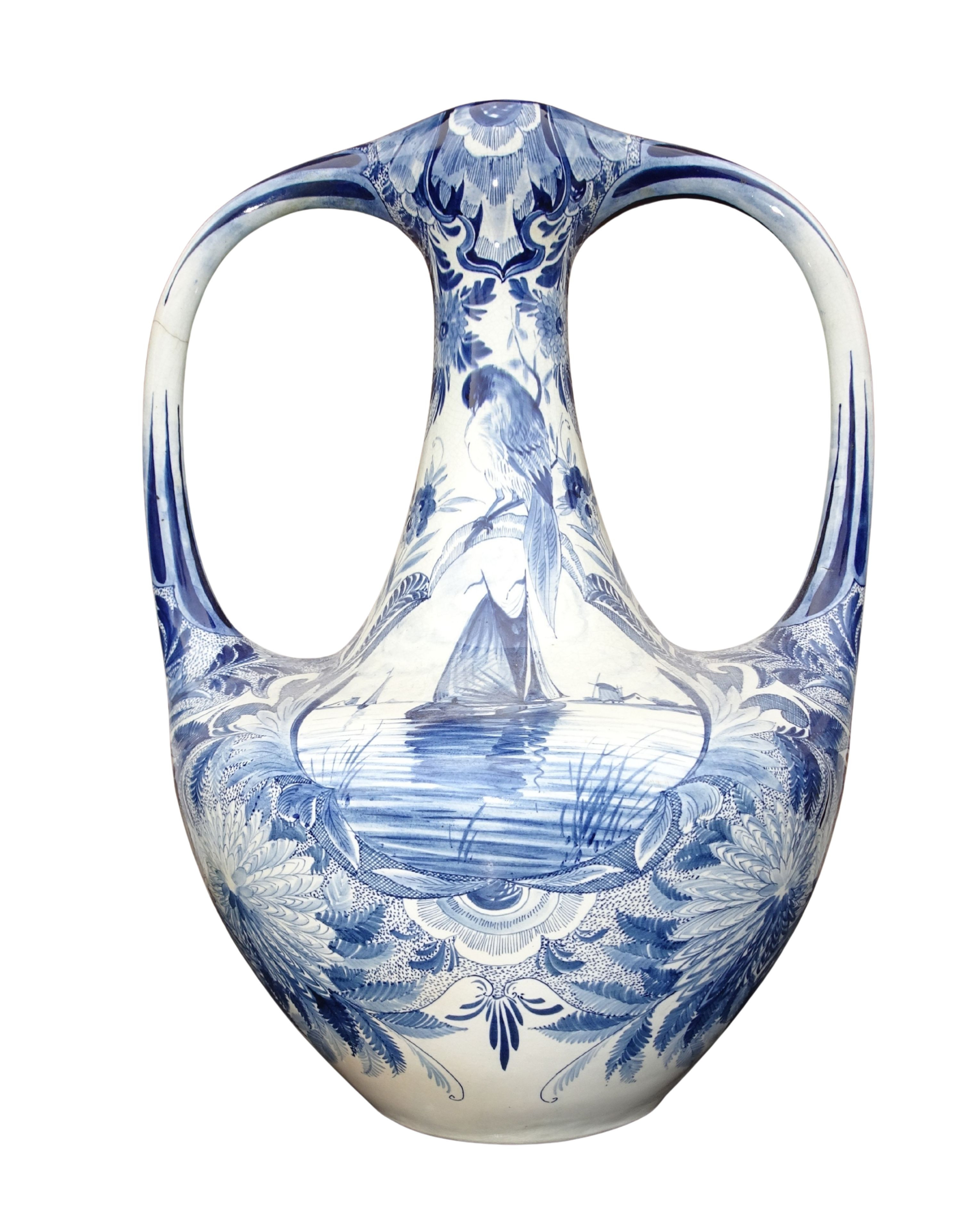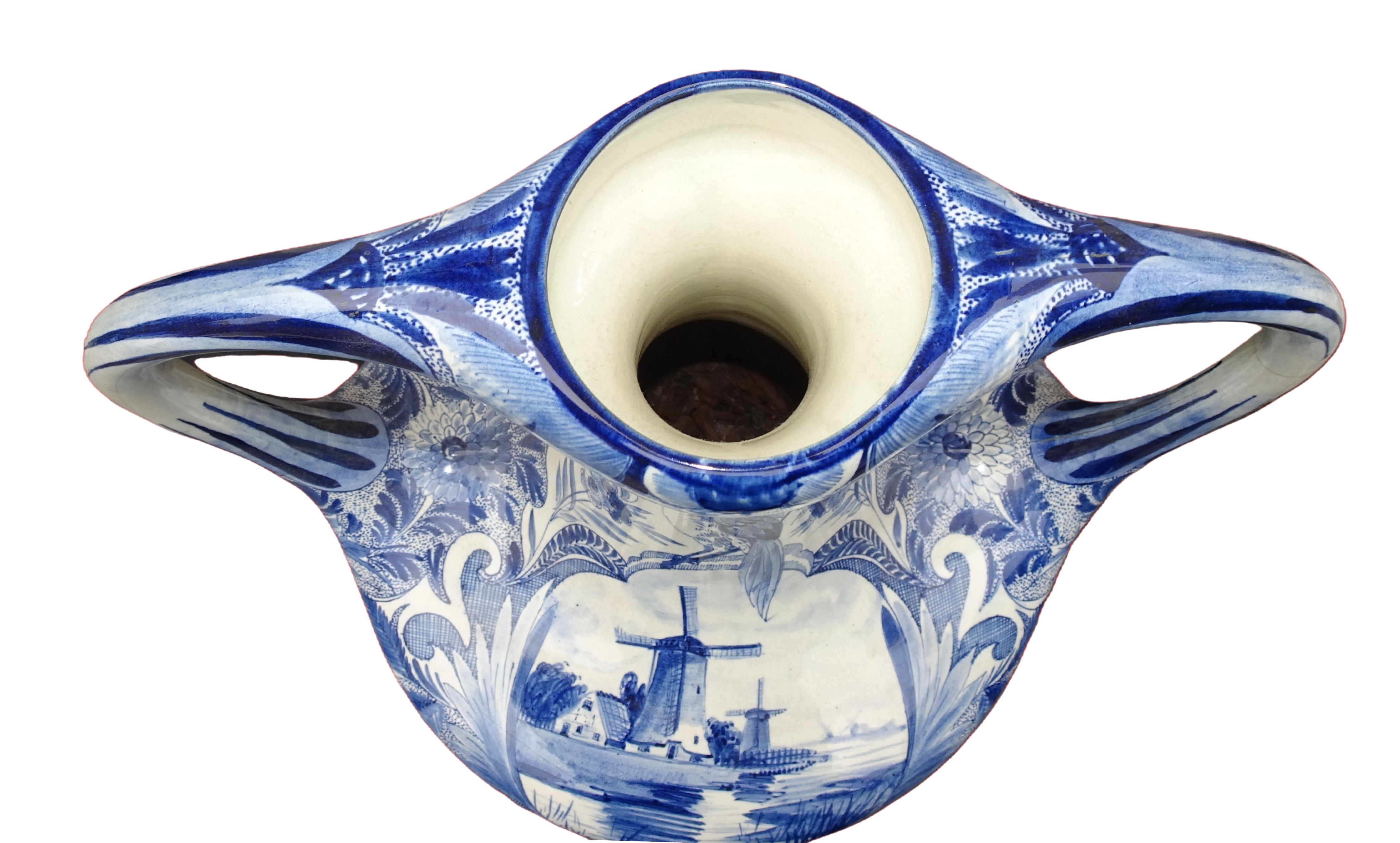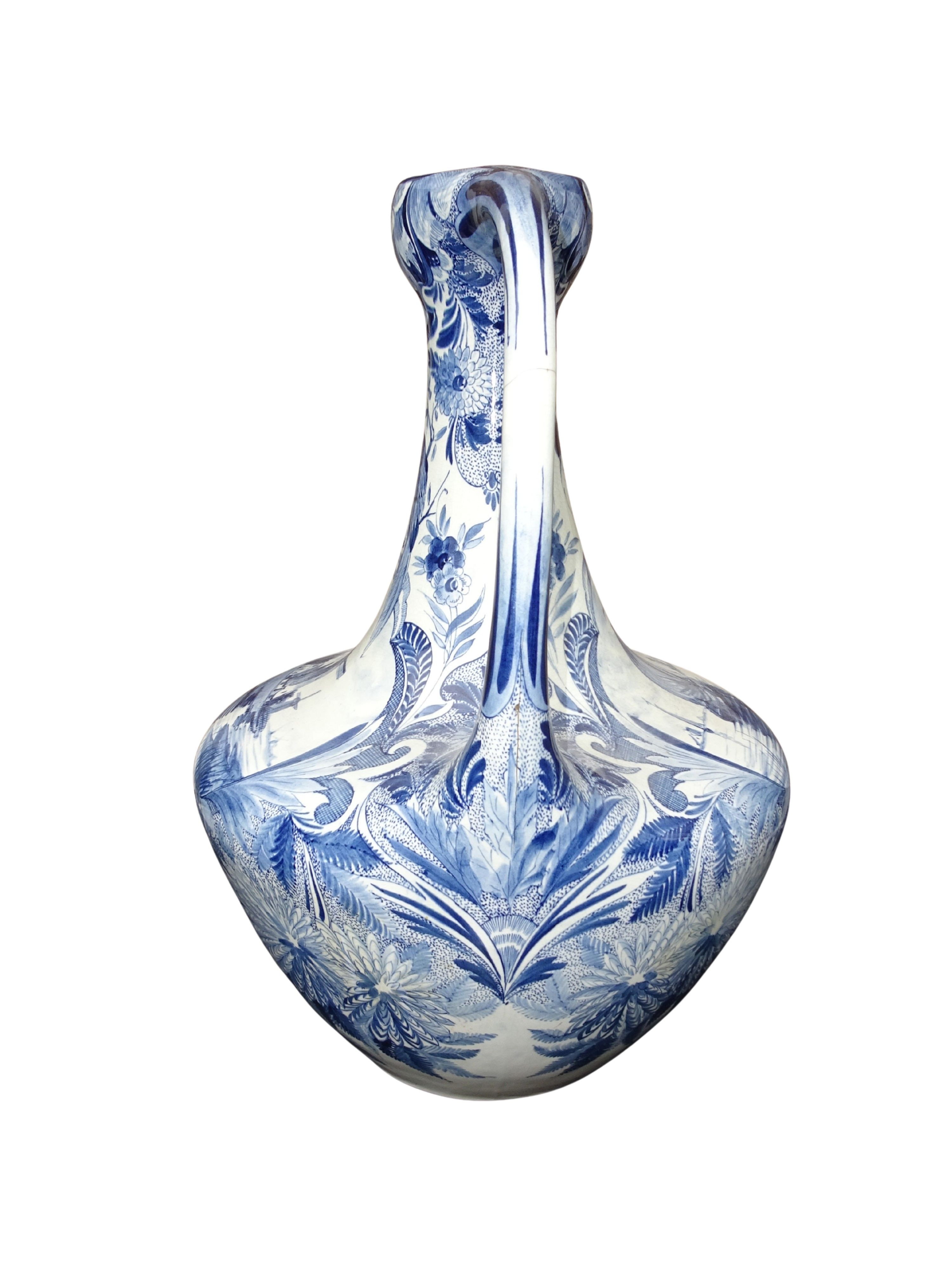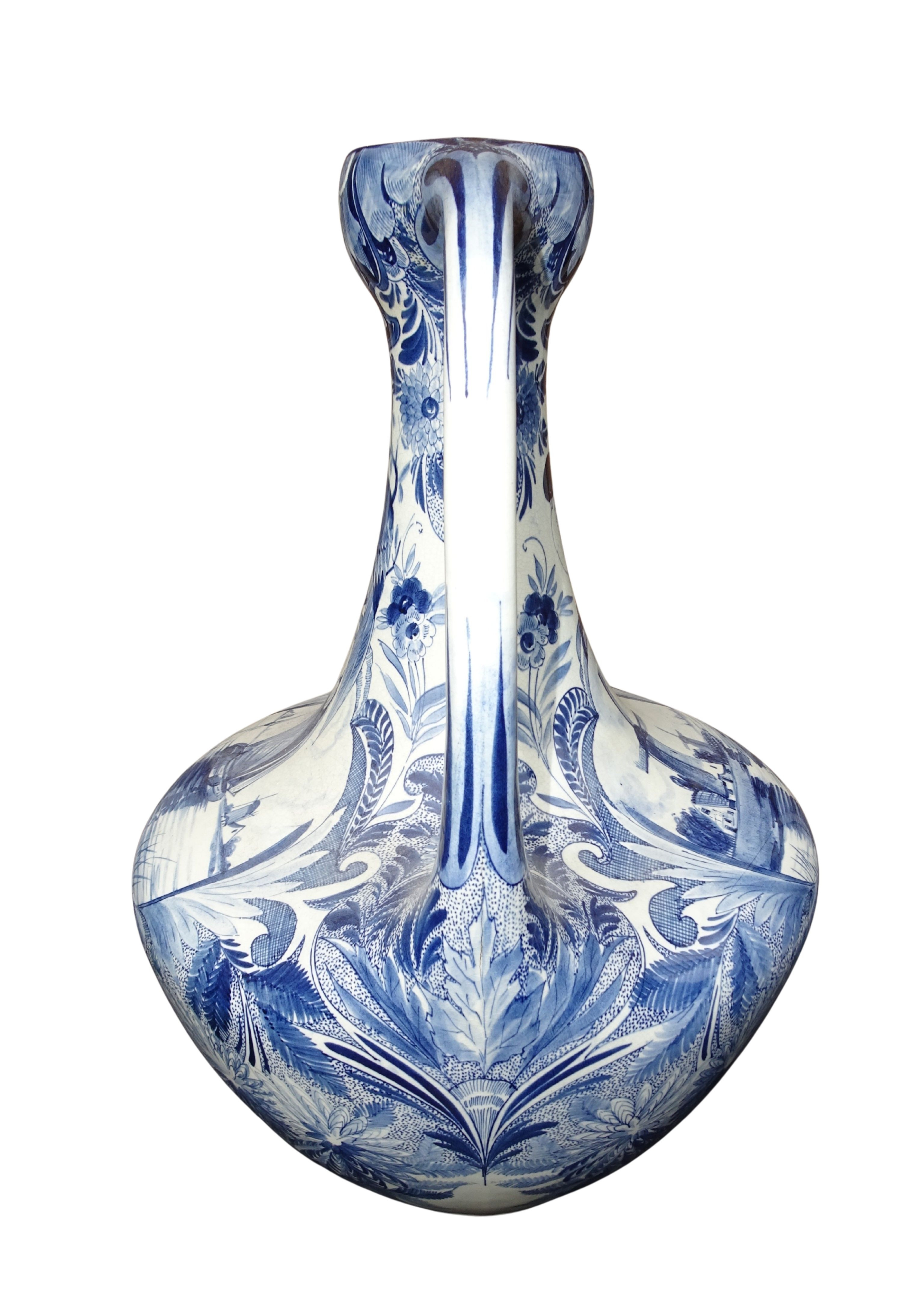 Grote 50 cm hoge handgeschilderde vaas van Plateelbakkerij Zuid-Holland te Gouda, blauw-wit decor Delftsch model amfora.