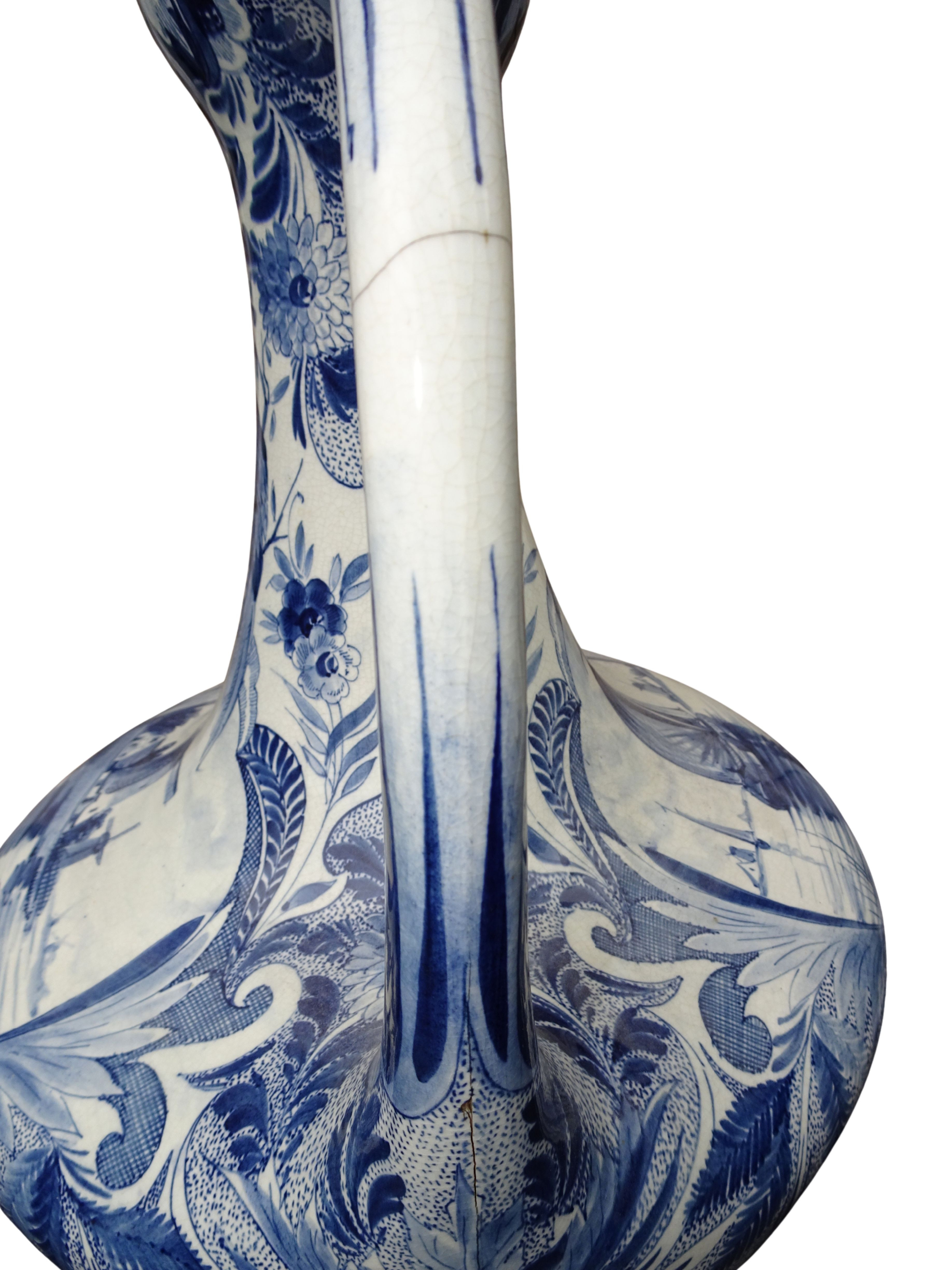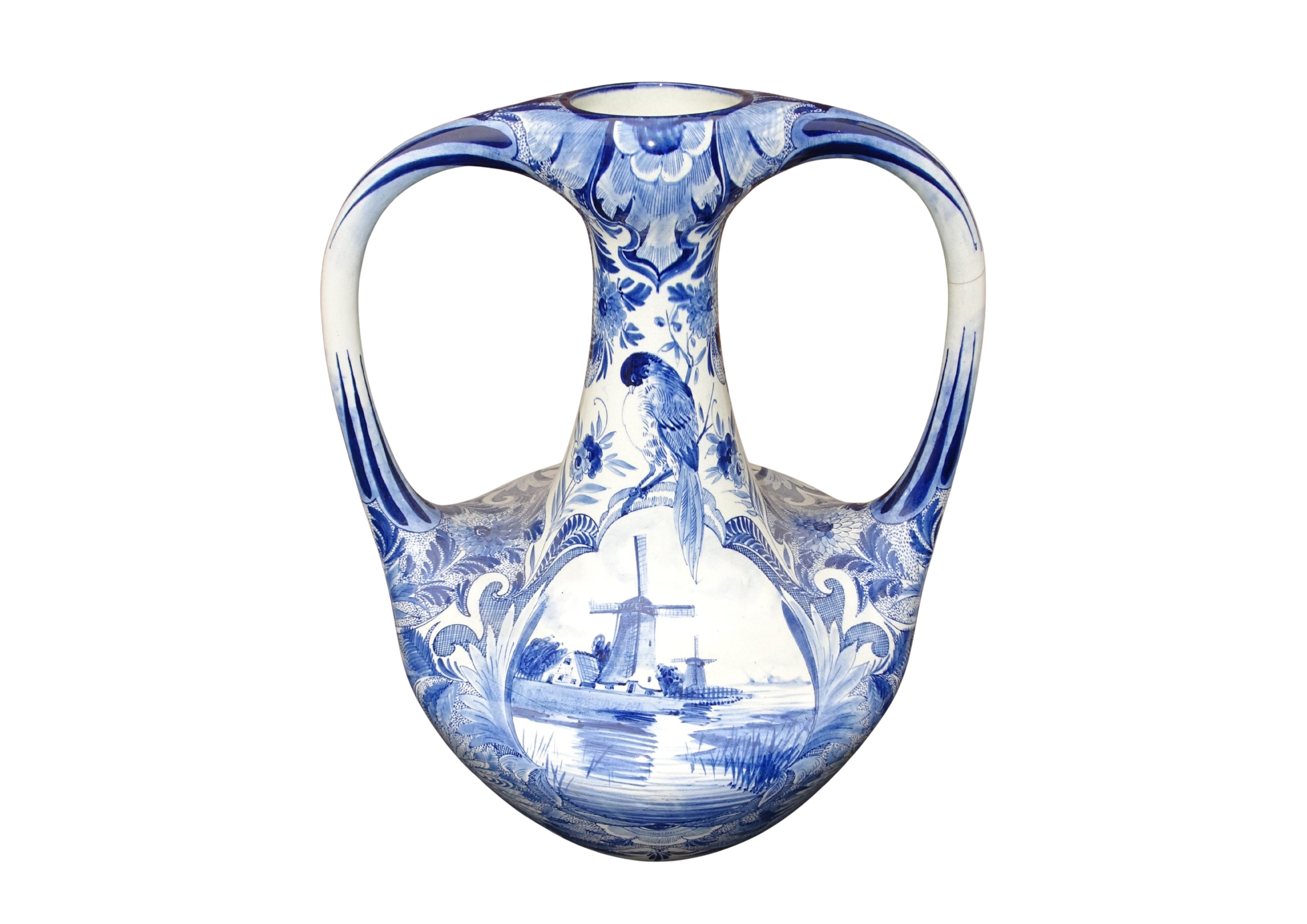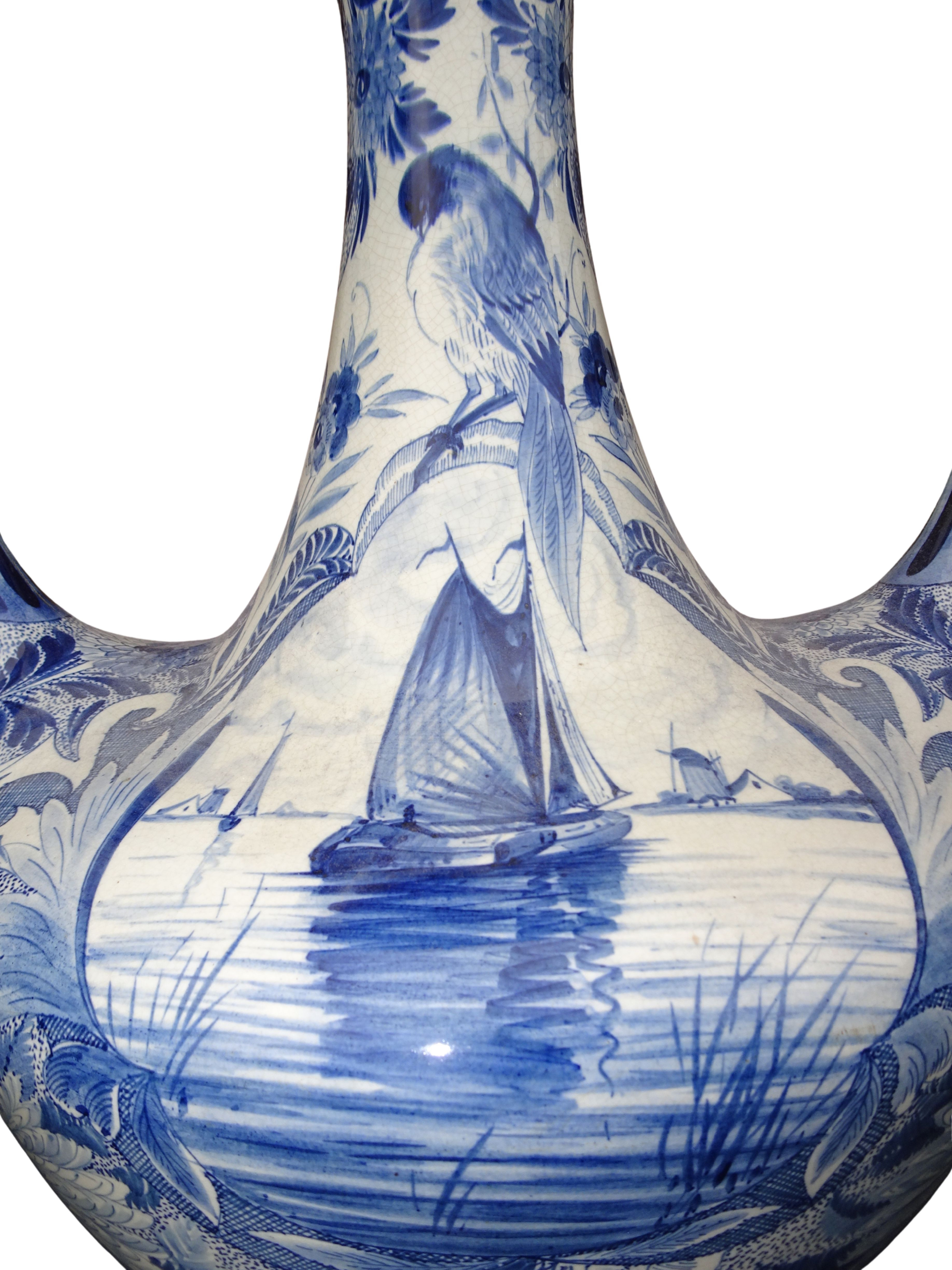 Grote 50 cm hoge handgeschilderde vaas van Plateelbakkerij Zuid-Holland te Gouda, blauw-wit decor Delftsch model amfora.