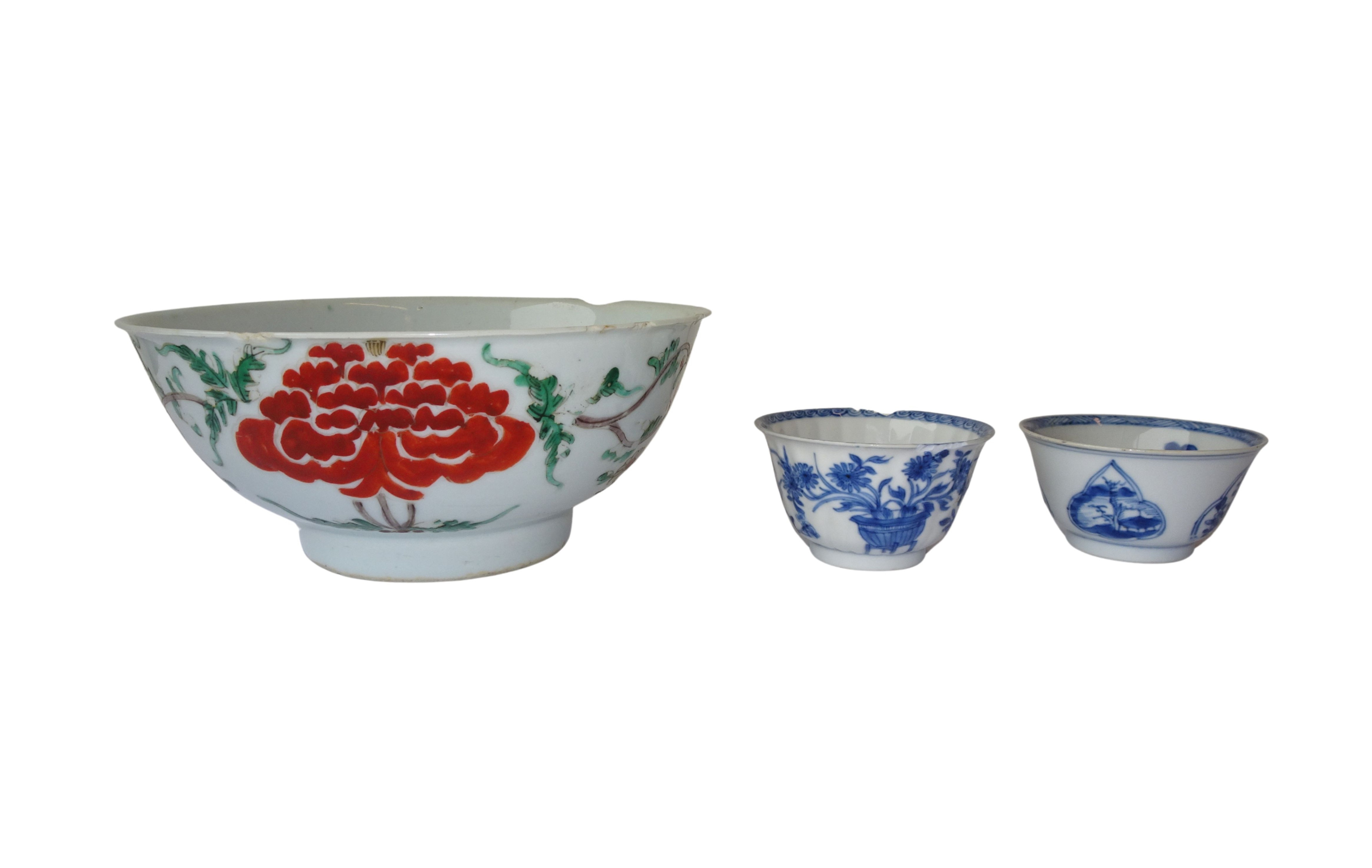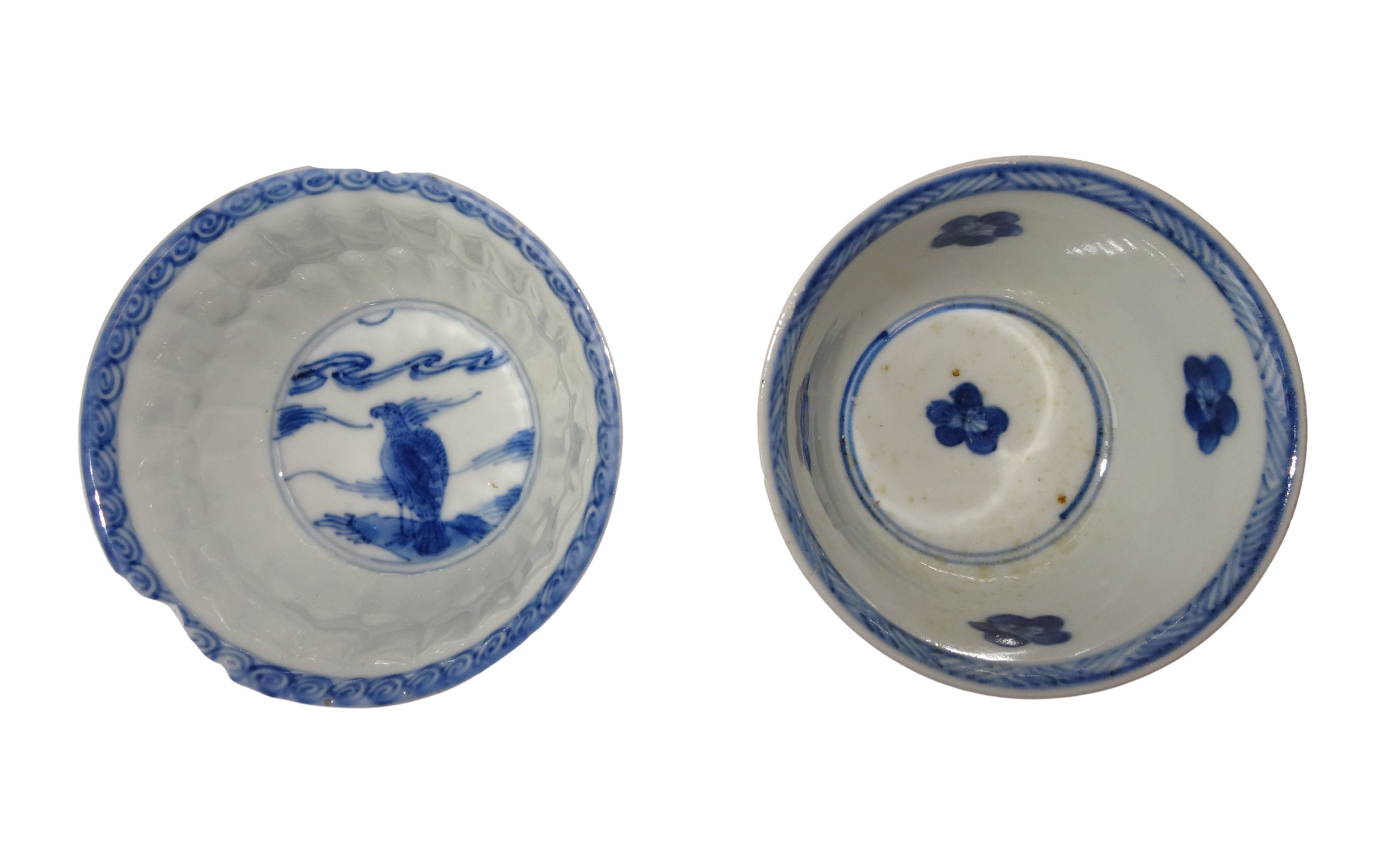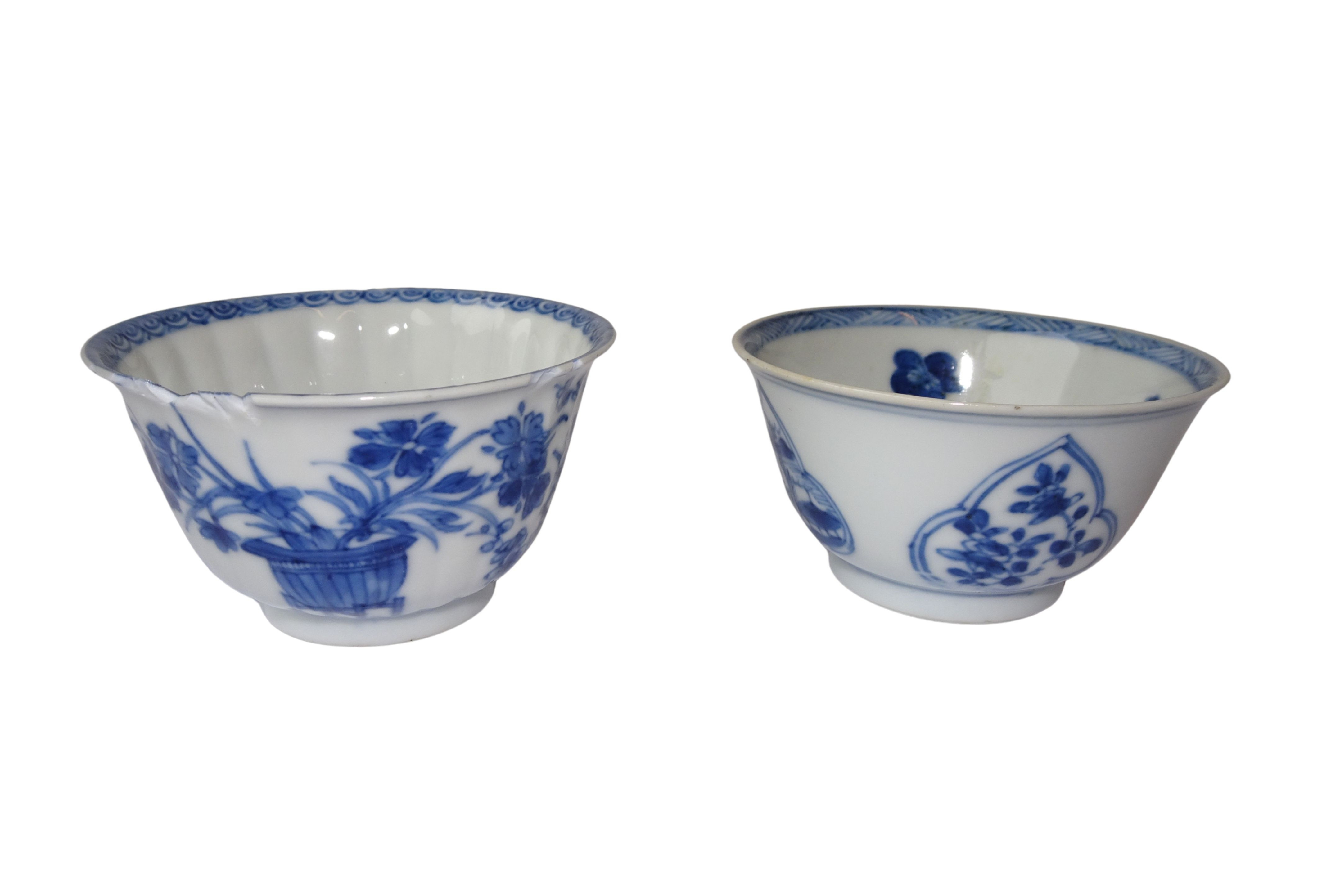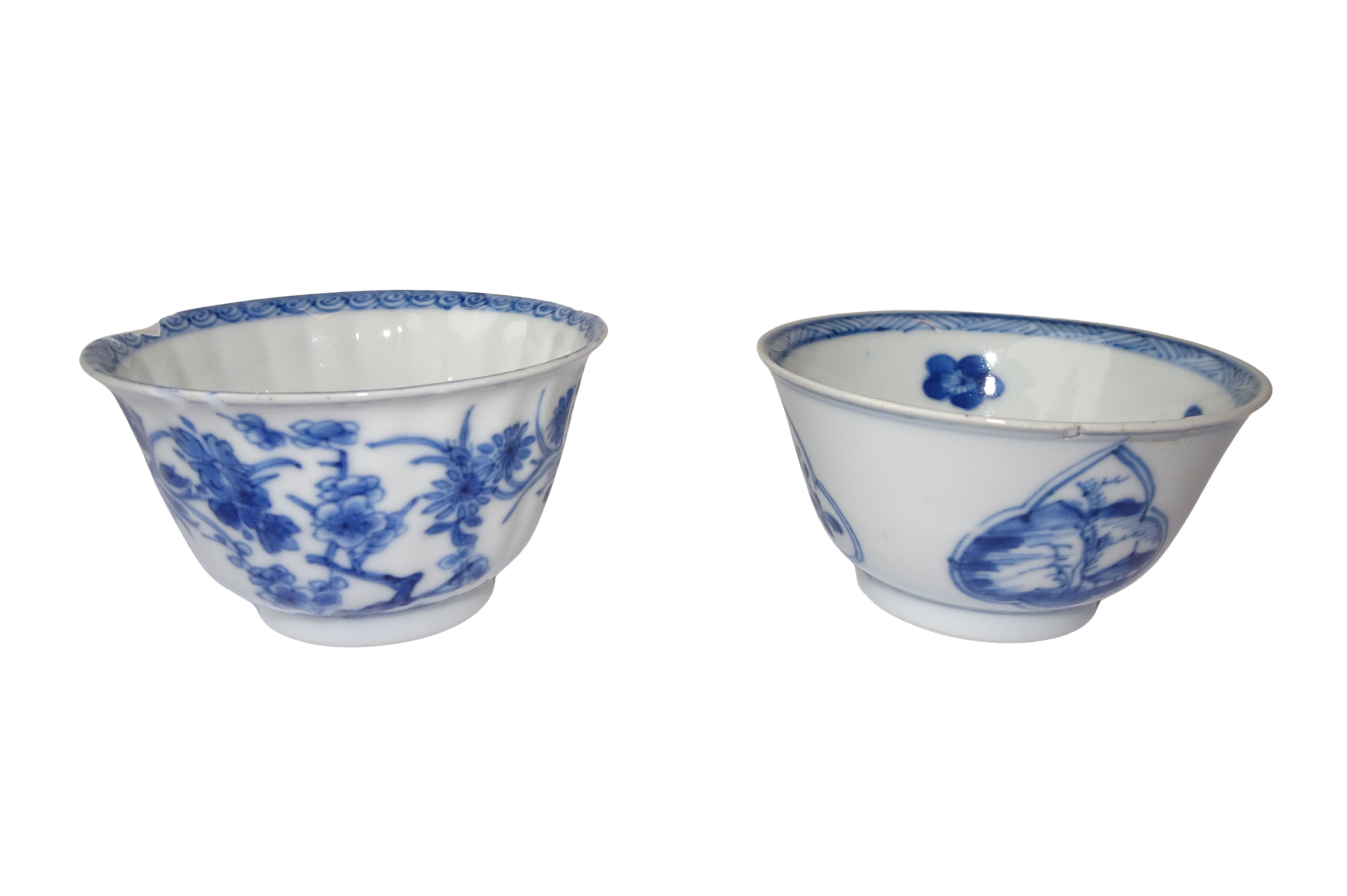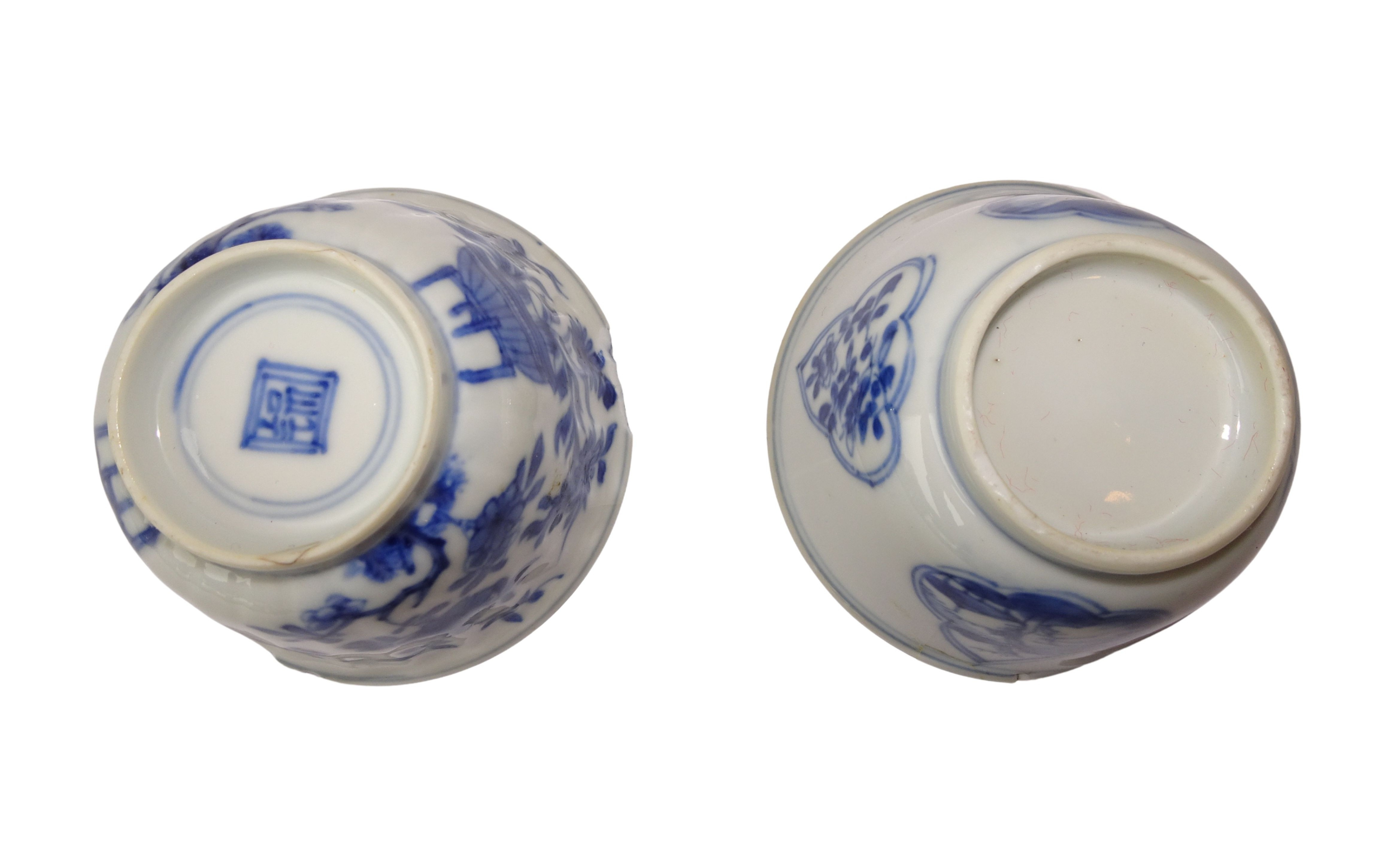2 Blauw-wit Chinees Porseleinen Theekopjes, beschadigd. Afmetingen