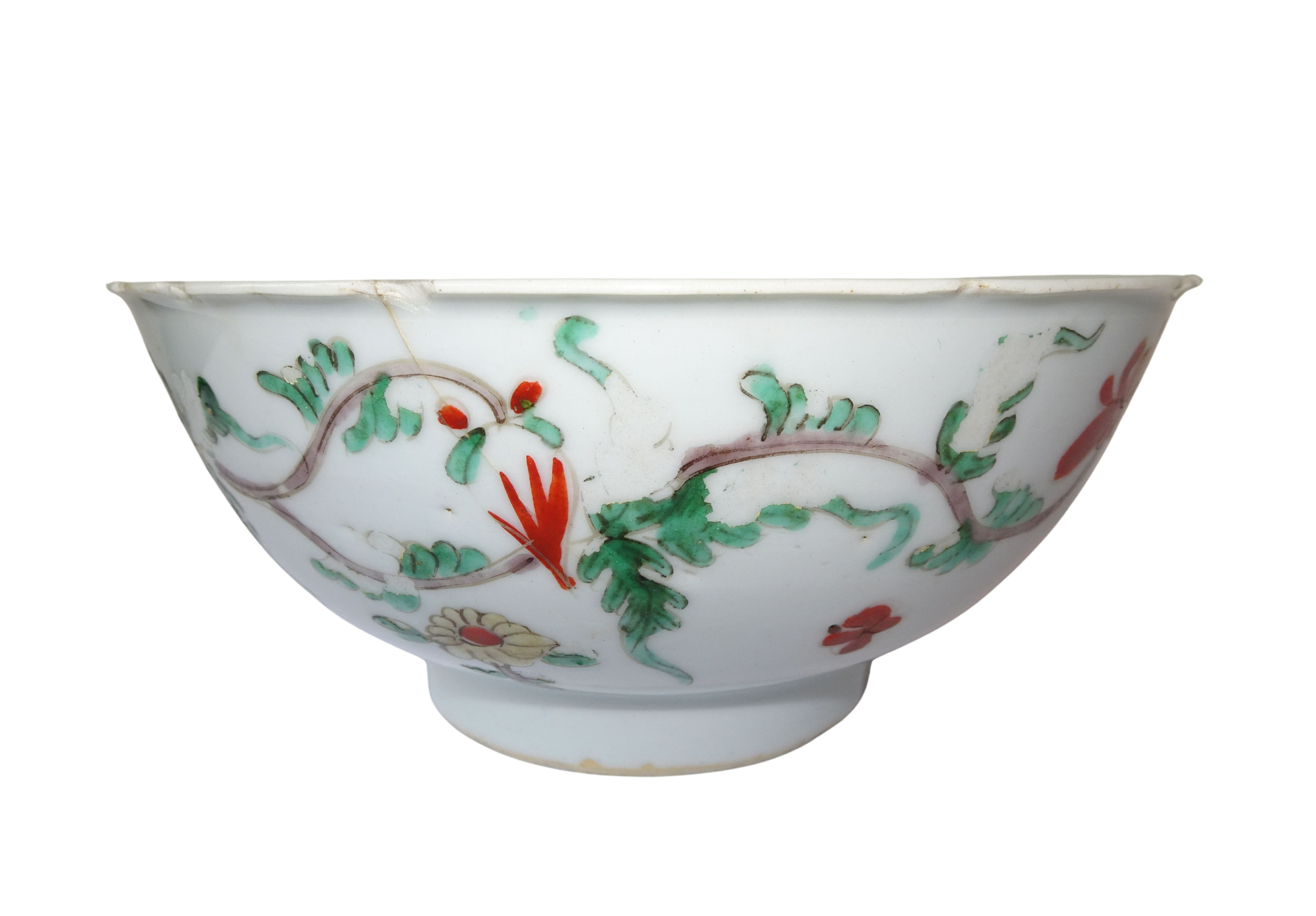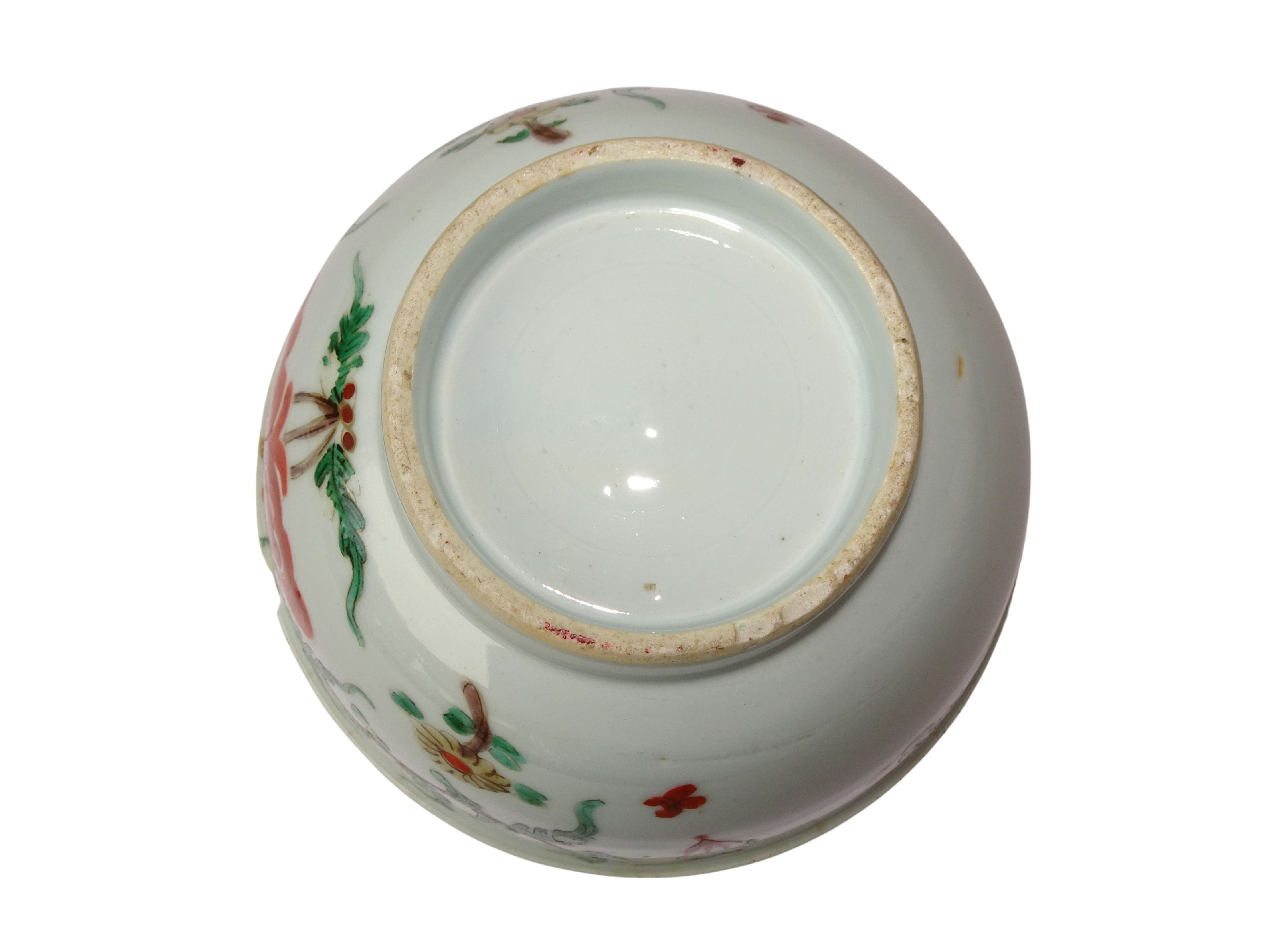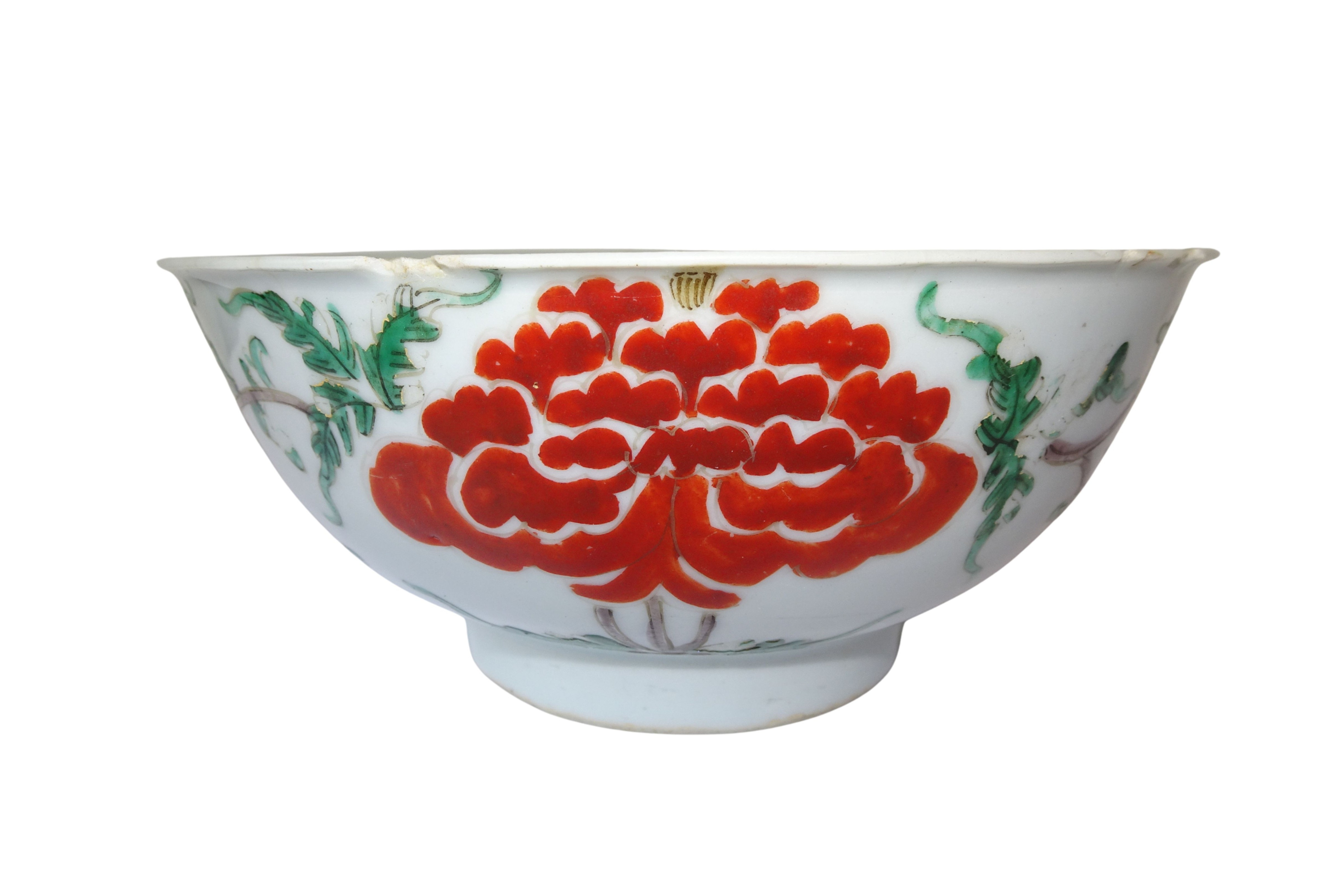 1 Grote Chinees porseleinen Famile Rose kom met pioenroos, beschadigd. Afmetingen